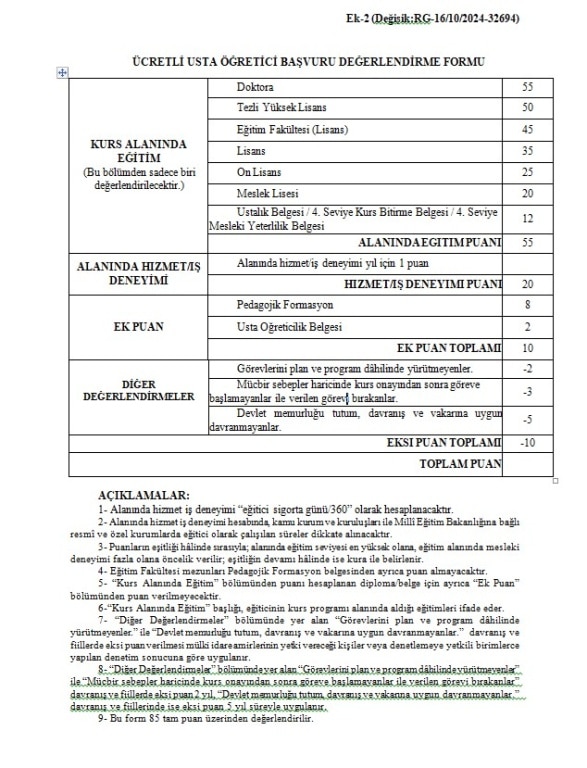 16/10/2024 tarihli Hayat Boyu Öğrenme Kurumları Yönetmeliği doğrultusunda kurumumuza 2025-2026 Eğitim Öğretim Yılı'nda açılacak kurs programlarında görevlendirilmek üzere EK-2 ücretli usta öğretici başvuru değerlendirme formuna esas belgeler ile kadrosuz ücretli usta öğretici talepleri alınacaktır.